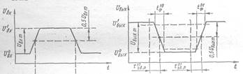 К динамическим параметрам, характеризующим свойства микросхемы в режиме переключения, относятся: время задержки сигнала при включении - интервал времени между входными и выходными импульсами при переходе Uвых ИЛЭ от U1вых до U0вых, измеренный либо на уровне 0,5 амплитуды импульса, либо на уровне порога чувствительности; время задержки сигнала при выключении- интервал времени между входным и выходным импульсами при переходе Uвых ИЛЭ от U0вых до U1вых, измеренный либо на уровне 0,5 амплитуды импульса, либо на уровне порога чувствительности; среднее время задержки.