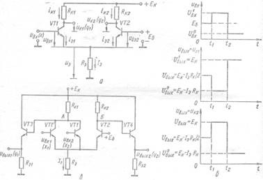 Основной частью ТЛЭС(элемент транзисторной логики с эмитерными связями ) является переключатель тока (рисунок 6а) , для улучшения схемы рис. 6 в в одно из плеч включено параллельно несколько транзисторов.