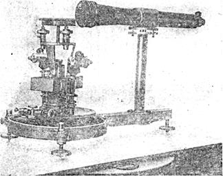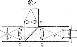 Он отличается тем, что в нем между крестом нитей М и окуляром помещаются две одинаковые линзы О1 и О2 . Так как крест нитей располагается в фокусе линзы О1 , то эта дополнительная система переносит изображение креста нитей в точку F с отношением 1:1, где это изображение и наблюдается в окуляр. Зеркало располагается в параллельном пучке между линзами О1 и О2 под углом 45° и оптической оси трубы. Освещение производят при помощи третьей линзы О3 , в фокусе которой помещают лампочку S.