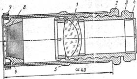 в тубус 5 с резиновым упорным кольцом 7. Положение тубуса 5 определяют по миллиметровой шкале, нанесенной на поверхности тубуса. Этой шкалой пользуются для измерения удаления выходного зрачка. Предел измерения составляет до 30 мм.