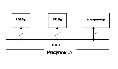 Для этой структуры характерно то, что сигналы, возникающие во всех шинах интерфейса, доступны сразу всем СИА, но в каждый момент времени только один абонент (СИА) может обмениваться информацией по интерфейсу.