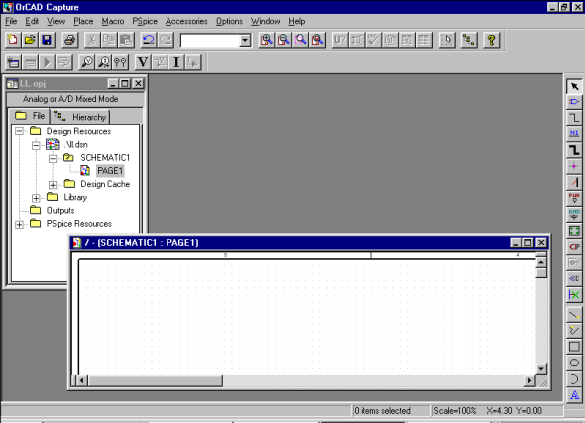 Так как необходимо моделирование схемы, то первоначально создается пакет Analog or Mixed. Для создания непосредственно самой схемы из дерева пакета выбирается элемент PAGE представляющий собой полотно с расположенной координатной сеткой (Рис. 2).