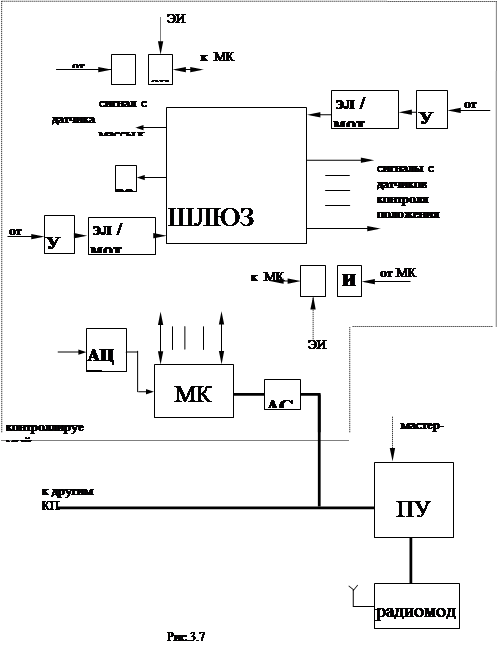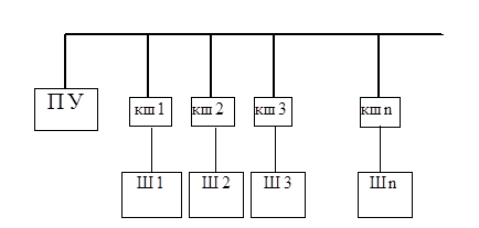 Пульт управления выполненный на базе компьютера совместимого с IBM PC и контролируемые пункты соеденены между собой в локальную сеть. Локальная сеть содержит пульт управления и ряд удаленных контроллеров, каждый из которых соединен с одним шлюзом. В проектируемой системе выбран магистральный тип интерфейса, с "шинной" топологией системы обмена. Режим обмена информацией — полудуплексный. В полудуплексном режиме любой из контроллеров может начать передачу, если на вход его последовательного интерфейса поступил запрос с пульта управления, то есть его сетевой адрес.Для уменьшения вероятности наложений контроллер перед выдачей сообщения прослушивает канал и начинают выдачу только при поступлении запроса от компьютера на его адрес. По режиму организации передачи, данная СЗКДП относится к сети с асинхронной передачей (момент считывания данных приемником определяется по сигналам запуска от передатчика; по окончании пересылки приемник выдает передатчику сигнал об окончании цикла передачи).