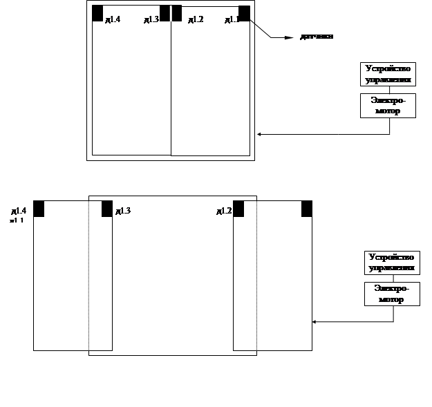 Теперь покажем, что из себя представляет контролируемый пункт объекта защиты. Конструктивно контролируемый пункт представляет из себя шлюзовую систему, с двумя сдвижными дверями (показать плакат). Каждой сдвижной дверью управляет электромотор блокировки дверей. При подаче управляющего напряжения от устройства управления (показывать чертеж) на электромотор двери соответственно открываются или закрываются. В закрытом положении двери блокированы. Внутри шлюза установлен датчик массы, служащий для подтверждения подлиности пользователя.