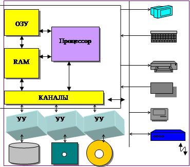 ОЗУ (RAM) - предназначены для размещения на период выполнения программ и их данных. Для связи с периферией в состав центральной части включаются каналы.