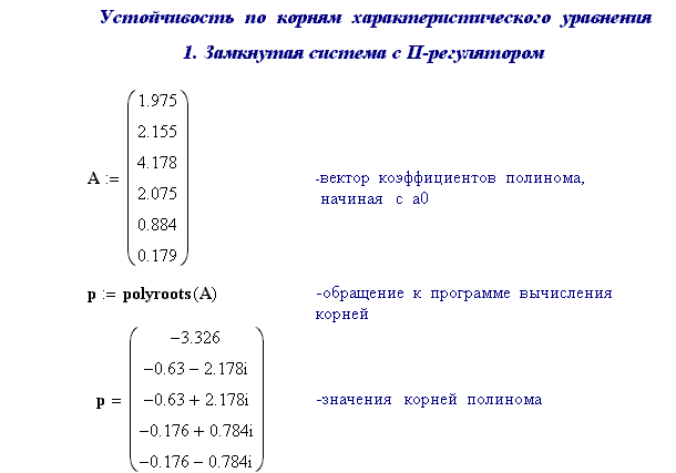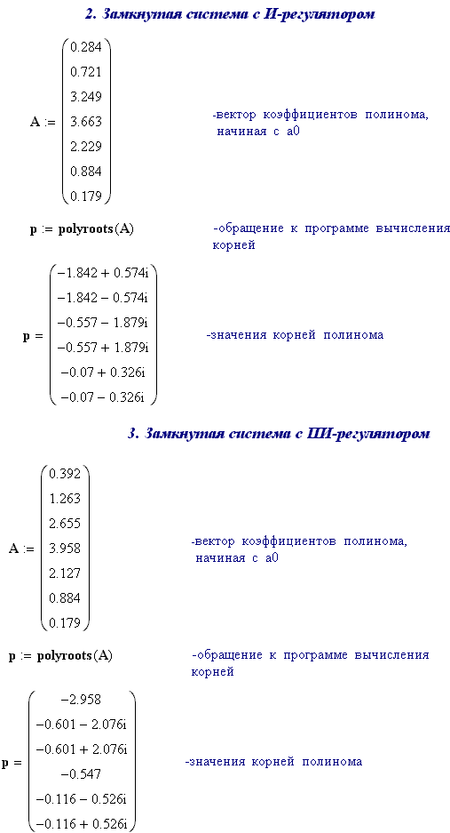 Ниже приведены результаты проверки устойчивости замкнутых систем по корням характеристического уравнения на ЭВМ в системе MathCad.