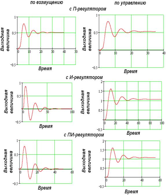 Ниже представлены графики переходных процессов по управлению и возмущению систем с П, И и ПИ-регуляторами. Графики построены в системе MathCad.