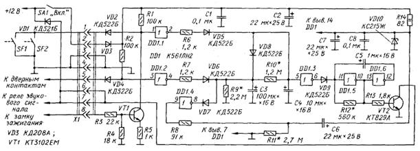 Схема автосторожа зображена на рис. 2.2. Після включення живлення тумблером SА1 поступає напруга до вузлів сторожа і починається повільна зарядка конденсатора С6 через резистор R11. В цей час на виході інвертора DD1.4 діє низький рівень, конденсатори С3 і С4 розряджені. Йде витримка часу, протягом якої власник автомобіля може вийти з салону і закрити за собою двері. Через відрізок часу, рівний = 0,7*R11*С6 (час - в секундах, якщо опір в мегаомах, а місткість – в мікрофарадах), на виході інвертора DD1.4 встановиться високий рівень і сторож перейде в черговий режим.