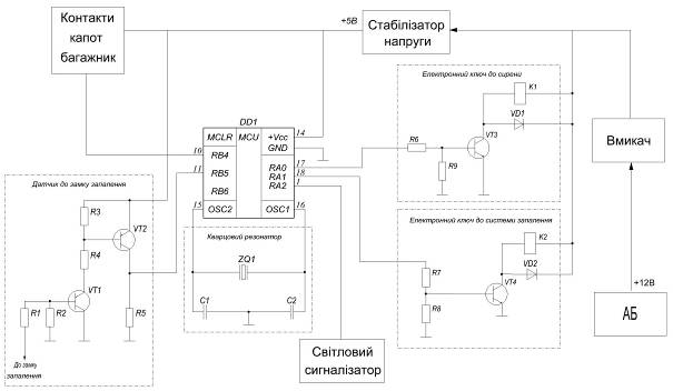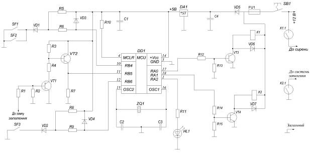 Як тільки відбудеться замикання хоч би однієї з пар контактів SF1 і SF2, високий рівень на вході RB4 зміниться низьким, мікроконтролер відповідно до програми встановить високий рівень на виходах RA0 та RA1, відкриються транзистори VT3 та VT4. В результаті контактами К1.1 реле К1 включається тривожна сирена і контактами К2.1 реле К2 блокується система запалення автомобіля.