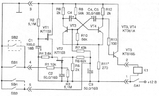 При відкритті дверей водія, замикаються контакти вимикача SB1, а при гойданні автомобіля спрацьовує датчик гойдання SB2, при цьому через резистор R1 на затвор транзистора VT2 поступає напруга, що відкриває його. Струм, що протікає через резистор R1, швидко заряджає «запам’ятовуючий» конденсатор С2, який протягом 1-2 хвилин підтримуватиме транзистор VT2 у відкритому стані, навіть тоді коли розімкнуться контакти вимикача SB1 і датчика SB2. Струм, що протікає через відкритий транзистор VT2 і резистор R6, заряджає конденсатор СЗ. За час 5–7 секунд напруга на ньому досягає 4 В. Якщо за цей час тумблер SA1 не буде вимкнений, то мультивібратор, зібраний на транзисторах VT3, VT4, із загальмованого стану перейде в автоколивальний режим. При цьому електронний ключ на транзисторі VT5 періодично включатиме реле звукових сигналів К1. Контактами цього реле включається штатний сигнальний пристрій автомобіля.