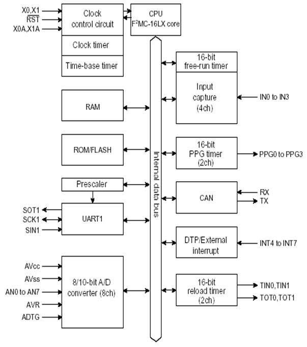 Рис. 1 Внутренняя архитектура микроконтроллеров серии MB 90385