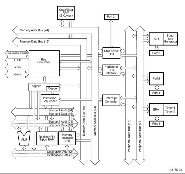 Внутренняя архитектура контроллеров серии 296 показана на рис. 2 (на примере 80296SA). Очевидно, что данные микроконтроллеры спроектированы на основе принстонской архитектуры (основанной на принципах фон Неймана), т.к. память для хранения данных и команд не разделена (единое адресное пространство), а микроконтроллер содержит две шины: данных и адреса.