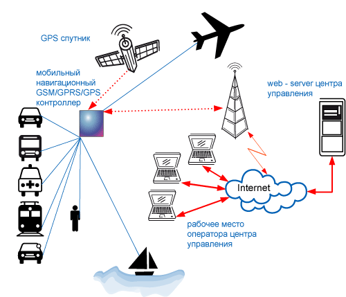 На подвижном объекте размещается мобильный навигационный контроллер с приемником GPS, gsm/gprs приемопередатчиком и различными датчиками. GPS-приёмники принимают сигналы с видимых спутников. Затем информация о географическом положении объекта, точном времени, данные с датчиков передаются в центр управления (web-server+ PC со специализированный программным обеспечением) по gsm каналу. Центр управления принимает и обрабатывает эти данные и отображает информацию о положении каждого движущегося объекта на карте в реальном времени. Центр управления может посылать команды на мобильный навигационный контроллер, например, включать звуковой сигнал, останавливать двигатель, изменять направление движения, доставлять сообщения и т.д.