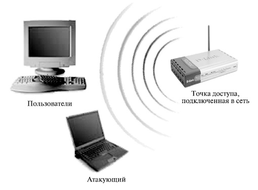 Наиболее распространенная проблема в таких открытых и неуправляемых средах, как беспроводные сети, - возможность анонимных атак. Анонимные вредители могут перехватывать радиосигнал и расшифровывать передаваемые данные, как показано на рис. 3.12.