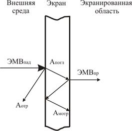 Рассмотрим процесс экранирования электромагнитного поля при падении плоской волны на бесконечно протяженную металлическую пластину толщиной d, находящуюся в воздухе (рис. 34). В этом случае на границе раздела двух сред с различными электрофизическими характеристиками (воздух—металл и металл—воздух) волна претерпевает отражение и преломление, а в толще экрана, ввиду его проводящих свойств, происходит частичное поглощение энергии электромагнитного поля. Таким образом, электромагнитная волна при взаимодействии с экраном отражается от его поверхности, частично проникает в стенку экрана, претерпевает поглощение в материале экрана, многократно отражается от стенок экрана и, в конечном счете, частично проникает в экранируемую область. В результате общая эффективность экранирования (величина потерь энергии электромагнитной волны) металлической пластиной определяется суммой потерь за счет поглощения (затухания) энергии в толще материала Апогл , отражения энергии от границ раздела внешняя среда—металл и металл—экранируемая область Аотр и многократных внутренних отражений в стенках экрана Амотр :