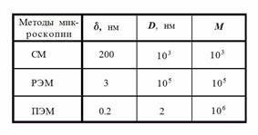 В настоящее время различают просвечивающую электронную микроскопию (ПЭМ) и растровую электронную микроскопию (РЭМ). Данные для сравнения РЭМ, ПЭМ и световой микроскопии (СМ) приведены в таблице 1.