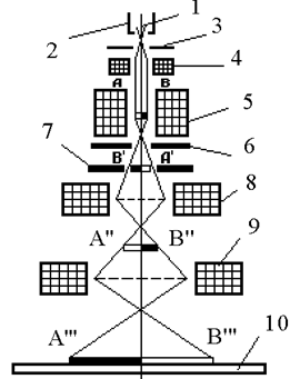 1 - катод, 2 - управляющий электрод, 3 - анод, 4 - конденсорная линза, 5 - объектная линза, 6 - апертурная диафрагма, 7 - селекторная диафрагма, 8 - промежуточная линза, 9 - проекционная линза, 10 – экран