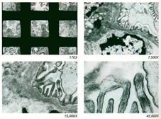 Рис. 3. Электронные изображения биологической ткани, полученные при различной степени увеличения. На первом изображении с увеличением в 170 раз видна графитовая микросетка, на которой располагают исследуемый объект