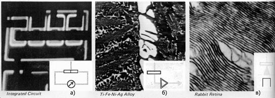 Рис. 7. Электронные изображения, полученное в режимах контроля наведенных токов в кристалле интегральной схемы (а), поглощенных электронов (сквозного сопротивления) в пленке сплава четырех металлов Ti - Fe - Ni - Ag (б), электронов, прошедших сквозь тонкий слой каучука (в)
