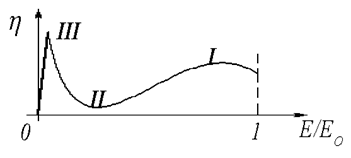 Если после бомбардировки образца электронным пучком измерить энергетическое распределение всех эмиттированных из него электронов в диапазоне энергий от 0 до Е0 (Е0 - энергия первичных бомбардирующих поверхность исследуемого образца электронов), то получится кривая, подобная изображённой на рис. 8. Высокоэнергетическая часть распределения (область I) имеет широкий максимум и соответствует отраженным электронам, меньшая часть которых имеет низкие энергии (область II). Увеличение числа эмиттированных электронов, которые образуют область III, происходит за счёт процесса вторичной электронной эмиссии .