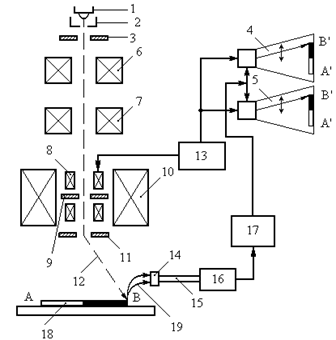 1 - термоэмиссионный катод; 2 - управляющий электрод; 3 - анод, 4 - ЭЛТ для наблюдения; 5 - ЭЛТ для фотографирования; 6,7 - первая и вторая конденсорная линзы; 8 - отклоняющие катушки; 9 – стигматор; 10 - объективная линза; 11 - объективная диафрагма; 12 - электронный пучок; 13 - генератор развёртки электронного луча микроскопа и ЭЛТ видеоблока; 14 - сцинтиллятор; 15 – светопровод; 16 – ФЭУ; 17 – видеоусилитель; 18 – исследуемый образец; 19 – регистрируемый сигнал (оптический, рентгеновский или электронный)