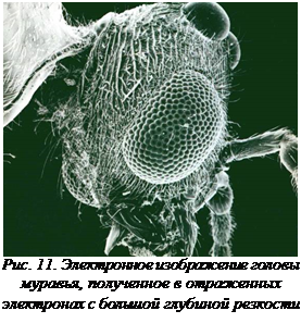 В РЭМ необходимо применять излучающую систему, формирующую на образце пятно очень малого размера и позволяющую перемещать его по всей поверхности образца. Вследствие того, что диаметр пучка электронов поддерживается в пределах нескольких микрометров на достаточно большом расстоянии от поверхности образца, глубина резкости велика, что очень важно при исследовании рельефных поверхностей микрообъектов (рис. 6). Эта особенность РЭМ, которой полностью лишены световые и просвечивающие электронные микроскопы, обеспечивает РЭМ большое практическое значение и при небольших увеличениях (рис. 11).