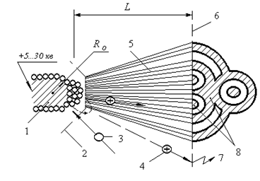 1 - образец исследуемого материала (наконечник иглы); 2 - зона ионизации;