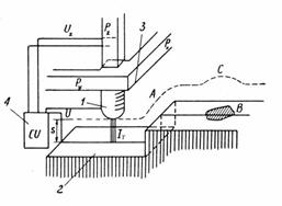 1 – игла; 2 – исследуемая поверхность; 3 – трехкоординатный пьезопривод; 4 – система обратной связи