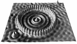 Рис. 16. РТМ-изображение «квантового загона» - 48 атомов Fe по окружности диаметром 14,6 нм с движущимися внутри электронами (волновой рельеф) на медной пластине