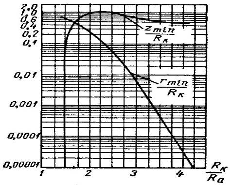 для различных отношений радиусов кривизны анода и катода приведены на рис.6. После выхода луча через анодную диафрагму в рабочую камеру, где электрического поля нет, он под влиянием объемного заряда начинает расходиться, хотя его минимальное сечение и находится в пространстве за анодом. Величина радиуса минимального сечения пучка