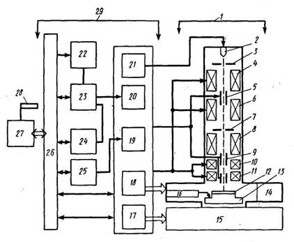 1 — электронно-оптическая система, 2 - электронная пушка, 3, 7 — формирующая первичный электронный пучок и промежуточная диафрагмы, 4 - магнитная линза, формирующая электронный пучок, 5 -отклоняющая пластина, б, 8 - промежуточная фокусирующая и уменьшающая магнитные линзы, 9 - система электродов отклонения и отключения электронного пучка, 10 - магнитная система отклонения электронного пучка, 11 - проекционная магнитная линза, 12 -экспонируемая подложка, 13 - координатный стол, 14 — шлюзовая система загрузки и смены подложек, 15 - вакуумная система с безмасляными средствами откачки, 16 - система привода координатного стола, 17 - блок контроля и управления вакуумной системы, 18 - система управления координатным столом и загрузкой - выгрузкой подложек, 19 - блок питания и контроля магнитной системы, 20, 25 -блок и система контроля электронно-оптической системы, 21 - высоковольтный блок, 22 — буферное быстродействующее запоминающее устройство, 23 - арифметический блок расчета коррекций, 24 -система контроля изображения и совмещения, 26 - интерфейс, 27 — быстродействующая суперЭВМ, 28 - магнитная лента с топологической информацией, 29 - система управления