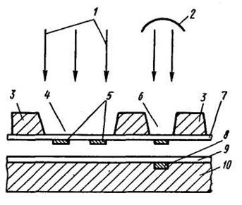 1 — поток рентгеновских лучей, 2 - канал совмещения, 3 — опорная рамка рентгеношаблона, 4 — область экспонирования (окно в опорной рамке), 5 -рисунок на слое, непрозрачном для рентгеновских лучей, б — окно для совмещения рентгеношаблона и подложки, 7 - пленка, несущая рисунок и прозрачная для рентгеновских лучей, 8 — метка совмещения на подложке, 9 — слой рентгенорезиста, 10 — подложка