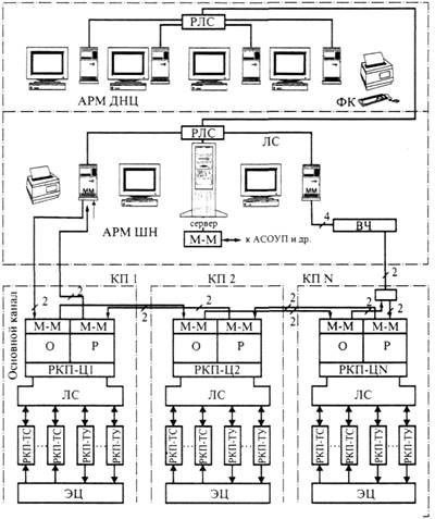 АРМ ДНЦ — автоматизированное рабочее место поездного диспетчера; ФК — функциональная клавиатура, обеспечивающая ввод и формирование команд телеуправления при взаимодействии центрального пункта управления с контролируемыми пунктами (КП); РЛС — расширитель локальной сети, позволяющий подключить к локальной сети несколько пользователей; М-М — модем — устройство приема передачи данных по линиям связи (О — основной, Р — резервный); АРМ ШН — автоматизированное рабочее место электромеханика ДЦ, выполняющее функции организации связи ПУ с КП по основному и резервному каналам, контроль и диагностирование аппаратуры ДЦ; РКП-ТУ, РКП-ТС — блоки телеуправления и телесигнализации, обеспечивающие сопряжение аппаратуры ДЦ на КП с устройствами ЭЦ; РКП-Ц — центральный блок управления контролируемыми пунктами, обеспечивающий взаимодействие КП с ПУ, с соседними КП, а так же блоками РКП-ТУ и РКП-ТС; ЛС — локальная сеть.