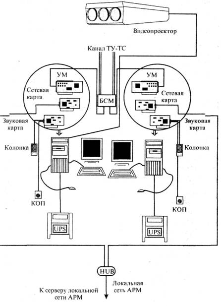 В системном блоке каждой рабочей машины установлены: универсальный модем УМ, сетевая карта, звуковая карта.