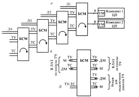 Сигнал ТС из четырехпроводной линии суммируется с сигналом ТС из двухпроводной линии и поступает на входы модемов. Для разделения сигналов ТУ и ТС в двухпроводной линии используется фильтр высокой частоты. Схема БСМ обеспечивает возможность приема сигналов ТС одновременно из двух- и четырехпроводных линий, а также использования БСМ для передачи сигналов в ретрансляционных пунктах (рис.5). На этом рисунке ЛАЗ — линейно-аппаратный зал, М — модулятор, ДМ — демодулятор.