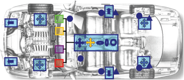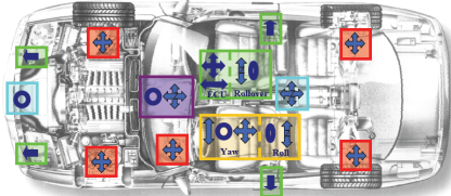 Зеленим кольором на рис.3 показано акселерометри, які реагують на зіткнення автомобіля. Для цього використовується датчики типу: ADXL78/193 . Для визначення перевороту використовується ADXL203 та ADX L 150/300. Жовтим кольором позначено використання акселерометра в динаміці керування рухом для цього також використовуються акселерометри ADXL203 та ADX L 150/300 .Червоним зображено керування підвіскою машини – це ADXL103/203 ADXL213 . Для навігації (фіолетовий) застосовують ADX L 150/401 ADXL203 .