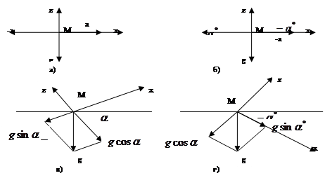 Вісь акселерометра, завдяки якій проводиться вимірювання, співпадає з продольною віссю автомобіля X. Цим же акселерометром проводиться вимірювання лінійного прискорення автомобіля. На рис. 6,а та рис. 6,б показані вектори додатного та від”ємного прискорення руху, та відповідні їм вектори прискорення сил інерції, а також вектори прискорення земного тяжіння, який розташований на осі Z. На рис. 6,в та рис. 6,г показано спосіб вимірювання продольного крену. Якщо автомобіль не рухається – показання акселерометра зумовлені тільки проекцією вектора прискорення земного тяжіння на вісь X: