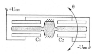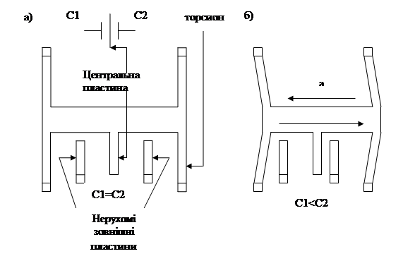 Ємнісний перетворювач працює на основі вимірювання ємності між рухомим електродом 1, який зазвичай розташований на рухомій частині акселерометра (чутливому елементі), та нерухомими електродами 2 які знаходяться на корпусі (рис. 10).