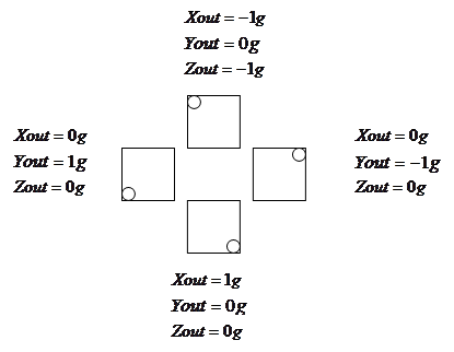 - відповідні кути нахилу по осям (X,Y). При цьому датчик буде розрізняти додатні та від’ємні кути нахилу, з цього випливає, що датчик буде вимірювати тільки крен при відсутності прискореного руху або взагалі при відсутності руху. Таким чином датчик можна використовувати в автомобілі для забезпечення зпрацьовування захисних засобів при різкому гальмуванні.