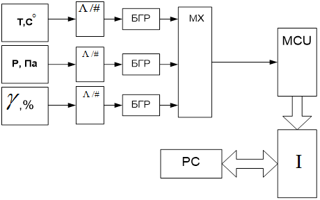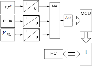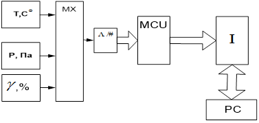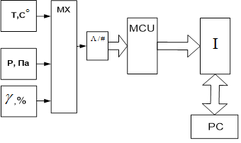 Три датчика вимірюють свої фізичні величини. На виході яких після вимірювання утворюється аналогова величина, яка подається через мультирлексор на АЦП. Який перетворює аналогову величину в цифровий код. Після цього цей код поступає на мікроконтролер. А потім через інтерфейс на ПК.[2]