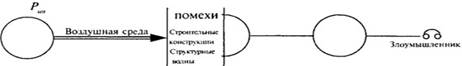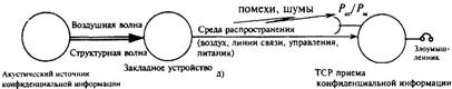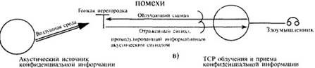 Утечка информативного акустического сигнала может осуществляться за счет воздушной акустической волны (рис.4а). Среда - "воздух (или воздух - твердое тело - воздух)". В этом случае в качестве технического средства перехвата может служить человеческое ухо, микрофон, направленный микрофон.