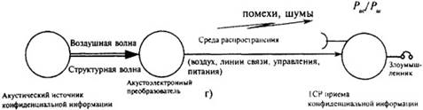 При организации защиты акустической (речевой) информации необходимо учитывать возможность её утечки из систем звукоусиления, магнитной звукозаписи, при передаче по каналам связи, систем звукового сопровождения кинофильмов и т.п. Утечка акустической информации может произойти из-за воздействия акустического сигнала на элементы тракта радиоэлектронных систем - конденсаторы, катушки индуктивности, элементы телефонного аппарата, вторичных часов и т.п. В этом случае преобразованный в электрический информационный акустический сигнал может распространяться на большие расстояния (рис.4г). Среда - "воздух - электроакустический преобразователь - воздух (или токопроводящие цепи)". TCP - приемник электрических сигналов или электромагнитных волн (электроакустический канал).