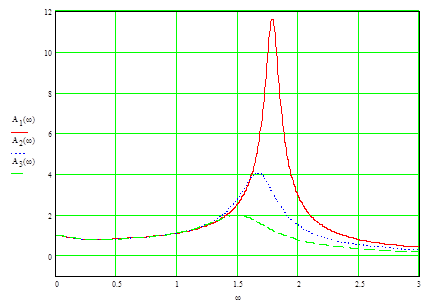1. Вначале определим выражения для АЧХ замкнутой системы и построим их графики. Из графиков видно, что по мере приближения значения коэффициента передачи к критическому значению резонансный пик становится все более ярко выраженным (более высоким и узким). Первый случай (тонкая линия) резонансный пик наблюдается на частоте ω1 =1,78 с-1, второй случай (пунктир) - на частоте ω2 =1,65 с-1, а в третьем случае- на частоте ω2 =1,46 с-1. в третьем случае колебания отсутствуют. Основная полоса пропускания системы ограничена сверху частотой 1,1 с-1. Скрипт документа частотного анализа системы приведен ниже.