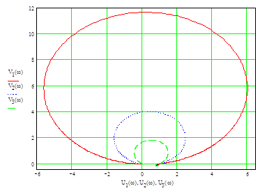 2. Для получения информации о фазовом сдвиге в системе построим графики ее ФЧХ или, что более наглядно, графики годографа КЧХ на комплексной плоскости. Видно, что на малых частотах система обеспечивает положительный фазовый сдвиг, который в асимптотике больших частот стремится к значению (-1,5π).