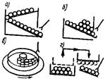 Накопительные и питательные устройства весьма разнообразны. Это могут быть устройства в виде лотков (рис.1 а, б, г), где упорядоченная поштучная подача деталей роботу осуществляется под действием их собственного веса, или в виде бункеров (рис.1, в) с подачей деталей путем вращения дна, на котором расположены детали.
