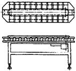 Двухвалковые конвейеры используют для перемещения с подпором цилиндрических заготовок (рис.8, д), например, колец, втулок, дисков. При перемещении заготовки вращаются, что позволяет применить указанные конвейеры для загрузки - выгрузки бесцентровых круглошлифовальных станков. Валковые конвейеры имеют разные исполнения в зависимости от формы валков. Наиболее распространенной конструкцией является конвейер с коническими валками, с углом конуса при вершине до 2°. Вращение двум валкам, укрепленным в корпусе, сообщается от привода через цепную передачу и звездочек, установленные на осях валков.