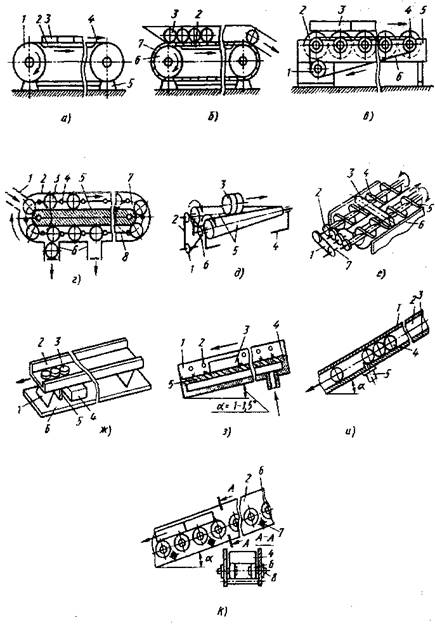 предназначены для гравитационного перемещения заготовок качением по роликам или скольжением по наклонной (в большей части прямой) поверхности длиной 2. .5 м и более (рис.8, и, к). Угол наклона конвейеров устанавливается в зависимости от способа перемещения заготовок, их массы и материала. При перемещении деталей качением