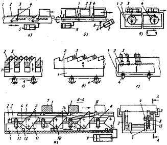Конвейеры прерывистого действия. Шаговые конвейеры наиболее распространены и бывают двух типов: с убирающимися собачками (рис.9, а) или поворачивающимися захватными устройствами (рис.9, б). У первого типа конвейеров заготовки (спутники) перемещают по направляющим захваты в виде подпружиненных храповых собачек, укрепленных на осях в штанге, совершающей возвратно-поступательное движение с помощью гидравлического цилиндра. При движении штанги вперед собачки упираются в заготовки и перемещают их на шаг. При обратном ходе собачки утапливаются в штангу и проходят под заготовки, не передвигая ее. Основным недостатком конвейера является засорение стружкой храповых собачек.