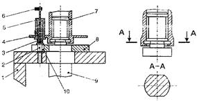 ЗУ, предназначенные для автоматической смены, помещаются в магазинное устройство, которое может быть выполнено в виде неподвижной стойке или поворотного диска с соответствующими гнёздами 1. Каждое ЗУ опирается на торцевую поверхность стойки фланца 8 и центрируется цилиндрическим пояском 9 по гнезду, имеющему форму отверстия с вырезом для прохода верхней части корпуса захвата. Угловое положение ЗУ определяется штифтом 2. Угловая фиксация ЗУ в руке робота 7 осуществляется фиксатором, который представляет собой подпружиненную скалку 4 с роликом 3. Он закрепляется во втулке 5, помещенной на руке робота 7. От поворота скалка удерживается винтом и связана также с рукояткой 6 для расфиксации ЗУ. На рисунке показана установка ЗУ в гнездо 1 магазина перед раскрытием байонетного замка (схема соответствует взятию ЗУ из магазина). Поскольку штифт 2 магазина входит в тот же паз 10 фланца 8, что и ролик фиксатора 3, то в момент установки ЗУ в магазин штифт 2 отжимает фиксатор 4, обеспечивая тем самым поворот руки робота 7 с фиксатором на угол 90°, что необходимо для раскрытия байонетного замка. При повороте руки 7 на угол 90° ролик отжатого фиксатора катится по поверхности фланца 8. После поворота на угол 90° рука уходит вверх, оставляя ЗУ в гнезде магазина 1.