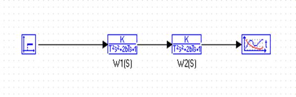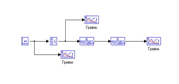 Для проведения анализа динамических свойств последовательного соединения исполнительного механизма и объекта управления при скачкообразном изменении Up от 0 до 70 В при t=0 до -70 при t=40c, необходимо в МВТУ смоделировать последовательное соединение объекта управления и исполнительный механизм, добавить временный график для просмотра поведения переходных процессов на каждом шаге интегрирования. Наглядное представление показано на рисунке 5.1.